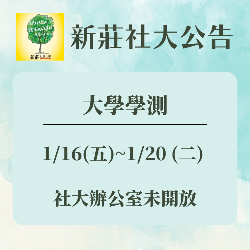 【新莊社大公告】 1/16(五)~1/20(二) 因新莊高中作為大學學測考場, 辦公室未開放報名 請各位同學留意,以免多跑一趟囉