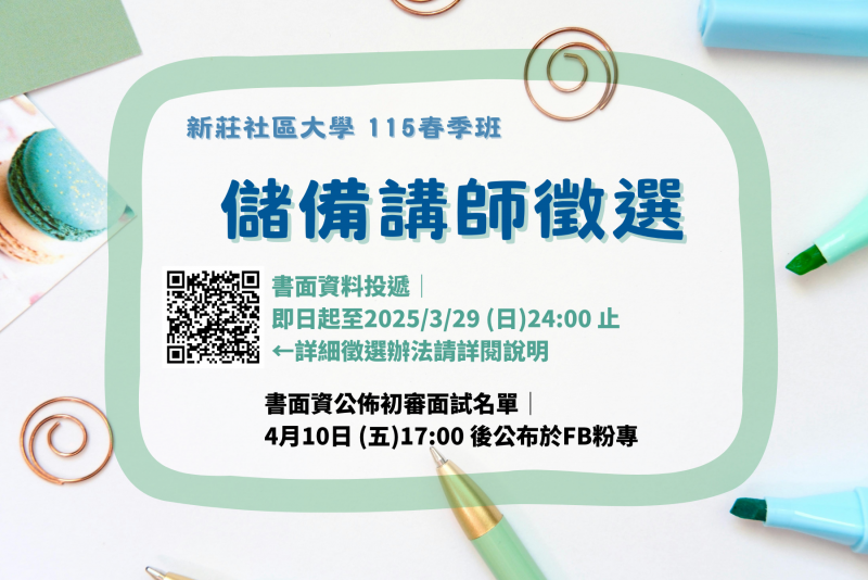 書面審查資料(皆 word 檔)請於 03月 29日前繳交 信件標題:【新莊社區大學115春儲備講師徵選_您的大名】 | ||