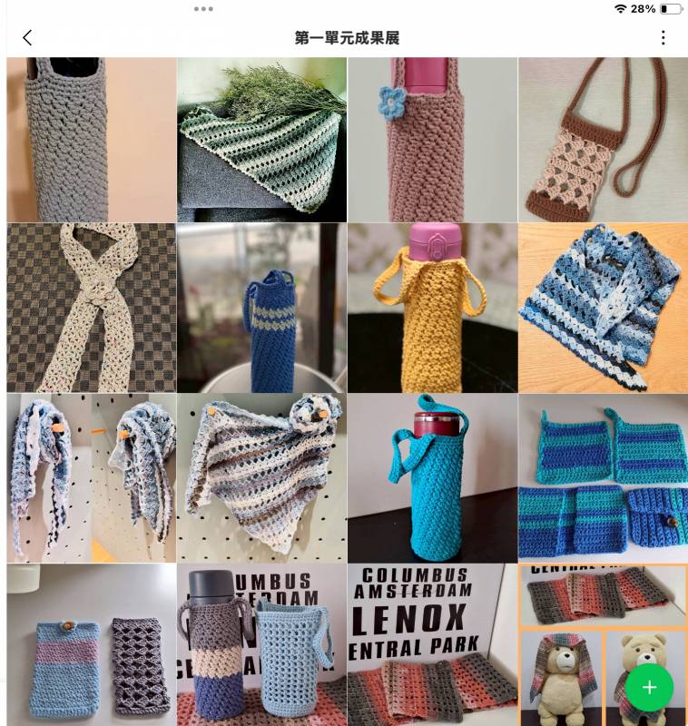 | 本學期編織作品盤點、複習針法 | 學員編織成品展示及分享鉤針學習心得 |